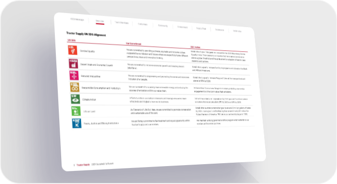 CEO Message Overview Team Members Customers Community Environment Supply Chain Governance SASB Index 9 Tractor Supply 2021 Sustainability Report Tractor Supply UN SDG Alignment UN SDG Our Commitment 2021 Action Gender Equality We are committed to providing a diverse, equitable and inclusive culture supported by our Mission and Values where we respectfully foster different perspectives, ideas and innovative thinking. Established 5-year DE&I goals and included in the 2022 Bloomberg Gender Equality Index. This represents companies that have earned a score at or above a global threshold and the achievement or adoption of best-in-class statistics and policies. Decent Work and Economic Growth We are committed to inclusive economic growth and creating decent jobs for all. Established a goal to increase funding to programs and education for Black and African Americans. Reduced Inequalities We are committed to empowering and promoting the social and economic inclusion of all people. Established a goal to increase People of Color at the manager level and above by 50% by 2026. Responsible Consumption and Production We are committed to sourcing more renewable energy and reducing the sources of emissions within our value chain. Enhanced our focus on our Scope 3 emissions, including new vendor engagement to drive down value chain emissions. Climate Action Efforts to reduce our carbon emissions and manage resources more effectively are integral to how we do business. Set net zero emissions in operations by 2040 goal and to reduce carbon emissions from our operations 20% by 2025 and 50% by 2030. Life on Land As Stewards of Life Out Here, we are committed to promote conservation and sustainable use of the land. Established a water conservation goal to reduce 25 million gallons of water by 2025. Our support and fundraising has secured nearly $14 million for Future Farmers of America “FFA” since our partnership began in 1985. Peace, Justice and Strong Institutions We are firmly committed to fair treatment and equal opportunity within Tractor Supply and our vendors. We maintain a strong governance ethics program which extends to our vendors and business partners.
