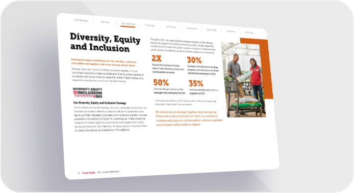 CEO Message Overview Team Members Customers Community Environment Supply Chain Governance SASB Index 15 Tractor Supply 2021 Sustainability Report Diversity, Equity and Inclusion Honoring the unique contributions our Team Members, customers, communities and suppliers make to our company and our culture Diversity, Equity and Inclusion (DE&I) is a business imperative. We are committed to provide a diverse, equitable and inclusive culture supported by our Mission and Values where we respectfully foster different backgrounds, experiences, perspectives, ideas and innovative thinking. Our Diversity, Equity and Inclusion Strategy The foundation of our DE&I strategy is to have a welcoming environment and to ensure the power of diversity, equity and inclusion is experienced every day by our Team Members, customers, communities and suppliers. We were purposeful in the addition of “equity” in our strategy, as it helps ensure that everyone at Tractor Supply has access to the same opportunities. Equity recognizes that we all don’t start from the same place and is a commitment to correct and address any imbalances in the workplace. Throughout 2021, we made substantial progress towards our DE&I strategy through the support of the DE&I Council led by our CEO. We also established comprehensive five-year DE&I goals to support and advance underrepresented groups across our workforce, as well as vendors, suppliers and communities: These goals are based on a 2021 baseline with a 2026 target year and are discussed in more detail in the next section. We believe we are stronger together when we put our Values into action and hold each other accountable to continuously improve and strengthen a diverse, equitable and inclusive culture built on respect. 2X Double the number of stores where Team Members mirror the communities we serve 50% Increase People of Color at the manager level and above by 50% 30% Increase commitment to funding programs and education for Black and African Americans by 30%. 35% Increase spending with diverse suppliers by 35%