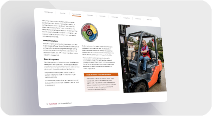 CEO Message Overview Team Members Customers Community Environment Supply Chain Governance SASB Index 13 Tractor Supply 2021 Sustainability Report Our summer intern program is a 12-week internship that provides interns with professional experience working in our Store Support Center in Brentwood, Tennessee. The interns work alongside Tractor Supply professionals in a variety of areas to make a real impact on our business. They have the opportunity work on projects in a department, get exposure to day-to-day operations and have a successful and meaningful internship. Internal Promotions We believe in growing our talent and providing opportunities to grow careers at Tractor Supply. Through skills development and leadership development programs, on the job learning and coaching, we were able to perform over 7,000 internal promotions in 2021. Over 70% of those internal promotions were at the manager level. Talent Management Talent Management is about cultivating our talent for future career growth and opportunities. We have processes such as performance management, talent reviews and succession planning with the goal of growing our talent pipelines. Our performance management process consists of quarterly performance check-ins and an end-of-year performance review. Our talent review process allows us to assess talent at all levels, plan for succession and differentiate how we invest in development. Development is one of our Tractor Supply Values. We expect our leaders to teach, coach and listen. We also create an environment where everyone can be a "star." We expect that managers work with all of our salaried Team Members to have an individual development plan which supports this Value. The foundation for performance and development is our competency model. This model provides six shared competencies across Tractor Supply and three competencies that are for our managers and above. These competencies are aligned and add to the expectations we share in our Tractor Supply Values. Team Member Value Proposition Team Members are our top priority at Tractor Supply. We work hard, have fun and make money to win together with: a values-driven culture where everyone feels connected; empowerment to serve our customers, community and each other; and opportunities for individual and professional growth.