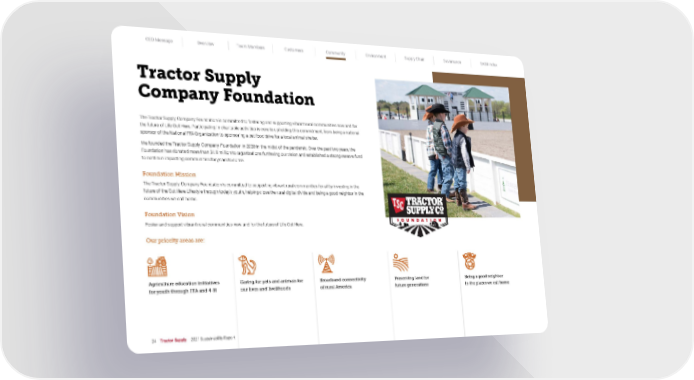 CEO Message Overview Team Members Customers Community Environment Supply Chain Governance SASB Index 24 Tractor Supply 2021 Sustainability Report Tractor Supply Company Foundation The Tractor Supply Company Foundation is committed to fostering and supporting vibrant rural communities now and for the future of Life Out Here. Participating in charitable activities is core to upholding this commitment, from being a national sponsor of the National FFA Organization to sponsoring a pet food drive for a local animal shelter. We founded the Tractor Supply Company Foundation in 2020 in the midst of the pandemic. Over the past two years, the Foundation has donated more than $1.8 million to organizations furthering our vision and established a strong reserve fund to continue impacting communities for years to come. Foundation Mission The Tractor Supply Company Foundation is committed to supporting vibrant rural communities for all by investing in the future of the Out Here Lifestyle through today’s youth, helping close the rural digital divide and being a good neighbor in the communities we call home. Foundation Vision Foster and support vibrant rural communities, now and for the future of Life Out Here. Our priority areas are: Agriculture education initiatives for youth through FFA and 4-H Caring for pets and animals for our lives and livelihoods Broadband connectivity of rural America Preserving land for future generations Being a good neighbor in the places we call home