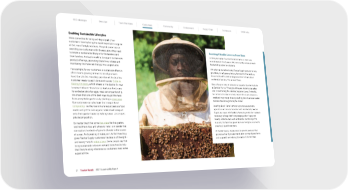 CEO Message Overview Team Members Customers Community Environment Supply Chain Governance SASB Index 21 Tractor Supply 2021 Sustainability Report Enabling Sustainable Lifestyles We’re committed to being an integral part of our customers’ lives by being the most dependable supplier of Out Here lifestyle solutions. We pride ourselves on providing our customers with the resources they need to create a sustainable lifestyle for themselves and their families. And we’re working to expand sustainable product offerings, promoting them in our stores and monitoring the materials that go into our products. For example, for our customers a sustainable lifestyle often means growing at least some of your own food. Our Life Out Here blog provides all the details a customer needs to get it done such as our Guide to Raising Chickens , which shares all the basics for how to raise chickens—from how to start your flock, care for and raise birds for eggs, meat or companionship. We share that one of the best ways to get the most from a vegetable garden is by planting a cover crop . Our customers can also learn the finer points of composting —so they can simultaneously reduce food waste and get the rich organic nutrients of compost onto their garden faster by helping speed up compost pile decomposition. Or maybe they’d like some free water for that garden. We’ll tell them how and where to install rain barrels that can capture hundreds of gallons of water in the course of a year. And speaking of water, our Life Out Here blog gives Tractor Supply customers the details of the right— and wrong—way to water a lawn . Some people say that living sustainably is its own reward. We’re here to help that lifestyle along whenever our customers need some expert advice. Learning Valuable Lessons From Bees In 2016, Kamal Bell founded Sankofa Farms to meet two crucial needs in the Durham, N.C. community: access to fresh food and inspiration for students. While Kamal started out using Tractor Supply products to help grow kale, collard greens, lettuce, fennel and other produce, he wanted to offer additional opportunities to learn about sustainable farming. The answer? Bees. Bees offer a number of educational opportunities for students at Sankofa Farms. “Throughout the year, students play a key role in maintaining the colonies,” explains Kamal. “In the fall, for instance, the students help inspect the structures once a week and may merge hives by stacking them to ensure weaker colonies have enough honey for winter.” Learning about Kamal’s efforts to promote sustainable agriculture and bee conservation with his students, Tractor Supply partnered with Sankofa Farms to provide the materials necessary to keep their honeybee population happy and healthy. With the hard work and careful monitoring of his students, the farm has grown from six honeybee colonies to over forty in just three years. At Tractor Supply, we are proud to provide products that promote a healthy environment, drive community resilience and support them in being Stewards of Life Out Here.