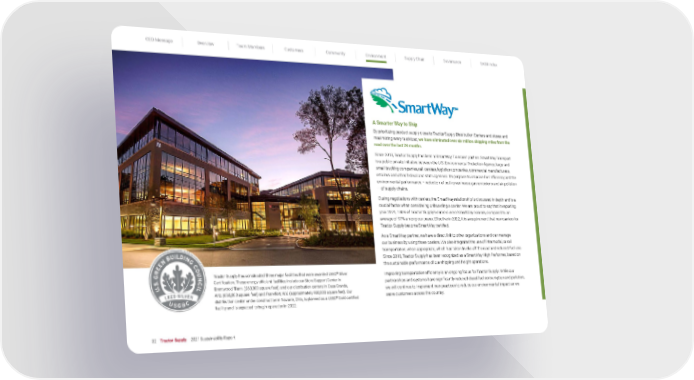 CEO Message Overview Team Members Customers Community Environment Supply Chain Governance SASB Index 32 Tractor Supply 2021 Sustainability Report A Smarter Way to Ship By prioritizing product supply close to Tractor Supply Distribution Centers and stores and maximizing every truckload, we have eliminated over six million shipping miles from the road over the last 24 months . Since 2013, Tractor Supply has been a SmartWay Transport partner. SmartWay Transport is a public-private initiative between the U.S. Environmental Protection Agency, large and small trucking companies, rail carriers, logistics companies, commercial manufacturers, retailers and other federal and state agencies. Its purpose: to improve fuel efficiency and the environmental performance – reduction of both greenhouse gas emissions and air pollution – of supply chains. During negotiations with carriers, the SmartWay relationship is discussed in depth and is a crucial factor when considering onboarding a carrier. We are proud to say that in reporting year 2021, 100% of Tractor Supply’s carriers were SmartWay carriers, compared to an average of 97% among our peers. Effective in 2022, it is a requirement that new carriers for Tractor Supply become SmartWay certified. As a SmartWay partner, we have a direct link to other organizations and can manage our business by using those carriers. We also integrated the use of intermodal, or rail transportation, when appropriate, which has taken trucks off the road and reduced fuel use. Since 2018, Tractor Supply has been recognized as a SmartWay High Performer, based on the sustainable performance of our shipping and freight operations. Improving transportation efficiency is an ongoing focus for Tractor Supply. While our partnerships and systems have significantly reduced diesel fuel consumption and pollution, we will continue to implement new practices to reduce our environmental impact as we serve customers across the country. Tractor Supply has constructed three major facilities that were awarded LEED ® Silver Certification. These energy-efficient facilities include our Store Support Center in Brentwood, Tenn. (260,000 square feet), and our distribution centers in Casa Grande, Ariz. (650,000 square feet) and Frankfort, N.Y. (approximately 930,000 square feet). Our distribution center under construction in Navarre, Ohio, is planned as a LEED ® Gold certified facility and is expected to begin operation in 2022.