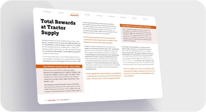 CEO Message Overview Team Members Customers Community Environment Supply Chain Governance SASB Index 14 Tractor Supply 2021 Sustainability Report Total Rewards at Tractor Supply We believe that serving our Team Members will equip them to better serve our customers. That’s why we provide competitive benefits, and our Team Members can take advantage of programs to help manage their time for both business and personal success. In addition, we provide competitive medical, dental and vision benefits to both eligible full- and part-time Team Members. Domestic partners are eligible for coverage as well as spouses. In 2020, we partnered with our Team Member Engagement Groups to get feedback on the inclusivity of our benefits and how to position the company as an inclusive employer of choice. As a result, in 2021 we added parental leave benefits, fertility benefits, and domestic partner benefits during our 2022 open enrollment and are investing in a wellbeing platform and incentives. We also recently announced that our Tuition Reimbursement program covers all courses – not just those that are job related. Overall, we will have invested $5 million dollars over two years to have more inclusive benefits. Our new paid parental leave policy provides six consecutive weeks of paid leave for eligible Team Members to care for new family members. We believe our Mission to work hard, have fun and make money supports our commitment to a fair day's wage. In 2021, we permanently increased the pay of all hourly wage Team Members, ending the year with an average hourly rate approaching $15 an hour. In addition to competitive base pay, we provide several tools to help Team Members achieve financial success, including a 401(k)-retirement plan with a matching program for all Team Members after one year of service; an employee stock purchase plan that allows all Team Members to buy stock at a 15% discount; and performance bonuses. Beginning in 2020, we also expanded long-term incentives for more than 2,000 store and distribution center managers to include equity compensation of restricted stock units. Tractor Supply Store Team Members are eligible for a monthly store sales bonus and all Team Members enjoy a 15% discount on Tractor Supply products. Since the beginning of the pandemic, our top priority has been health and safety. Entering 2021, that meant continuing paid sick leave for all Team Members affected by COVID-19. Since March 2020, we have enacted numerous policy changes to maximize Team Member safety, including providing personal protective equipment, free COVID-19 testing and vaccine incentive payments. You can find a summary of the actions taken over the last two years on our COVID-19 Response Page , some of which may no longer be in place due to the ever-changing environment, but this represents the scope and scale of our commitment to protect those we care most about. At Tractor Supply, we continue to prioritize health and safety and make investments in resources and protocols to help protect our Team Members and our customers. Team Member Assistance Fund - Here to Help Tractor Supply is here to help Team Members or eligible dependents who experience economic hardship. The Here to Help fund provides emergency financial support in the wake of natural disasters, serious illness, injury or catastrophic circumstances. Donations are voluntary, but every dollar donated helps a Team Member in need. Team Members can ask for help after 90 days of employment with Tractor Supply or Petsense. The maximum grant amount is $5,000. These grants are not loans—Team Members never need to repay any financial assistance given through Here to Help fund. Team Members Come Through in a Pandemic Tractor Supply Team Members, who are at the very heart of our relationships with our customers, have worked tirelessly during the pandemic to take care of each other and our customers while remaining focused on serving the rural lifestyle we all love. Their dedication to living our Mission and Values every day has made it possible to support our customers and the communities we call home during the pandemic.