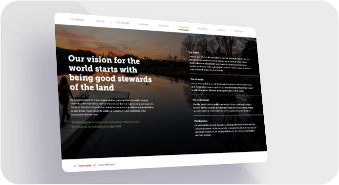 CEO Message Overview Team Members Customers Community Environment Supply Chain Governance SASB Index 29 Tractor Supply 2021 Sustainability Report Our vision for the world starts with being good stewards of the land It’s a common belief of Tractor Supply and our customers that we need to be good stewards of the land and our natural resources so that future generations can enjoy Life Out Here. This desire to protect our natural resources for our children and grandchildren is what drives Tractor Supply to enable our customers to live sustainably in the communities that we serve. Tractor Supply announced a new water reduction goal to conserve 25 million gallons by 2025. Our Vision Tractor Supply believes that a healthy environment, properly managed resources and vibrant communities are keys to a secure and prosperous future. Tractor Supply believes our responsibility as stewards of the land is to minimize our environmental impact while supporting our customers in their journey to become more sustainable to preserve Life Out Here. The Lifestyle Life Out Here symbolizes a rural lifestyle where people live with the land, not just on it. Stewardship means a respect for our natural resources, the animals around us and the neighbors that make up the communities in which we live. The Environment A healthy planet is vital to healthy communities. We are committed to being a company that has a positive environmental impact and are dedicated to finding innovative solutions for the betterment of future generations and the planet. The Business Our sustainability journey is focused on unlocking additional business value. By supporting customers in their pursuit of a sustainable lifestyle and improving our operational footprint, we are creating resiliency for our company, shareholders and Team Members.