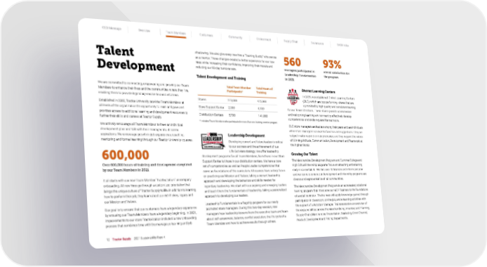 CEO Message Overview Team Members Customers Community Environment Supply Chain Governance SASB Index 12 Tractor Supply 2021 Sustainability Report Talent Development We are committed to connecting, empowering and growing our Team Members to enhance their lives and the communities where they live, enabling them to provide legendary service to our customers. Established in 2002, Tractor University provides Team Members at all levels of the organization the opportunity to learn and grow and provides access to additional learning and development resources to further their skills and careers at Tractor Supply. We actively encourage all Team Members to have an individual development plan and talk with their manager about career aspirations. We encourage growth in job experiences, coaching, mentoring and formal learning through our Tractor University courses. 600,000 Over 600,000 hours of training and development completed by our Team Members in 2021. It all starts with our new Team Member “Tractorization,” or company onboarding. All new hires go through a customized orientation that brings the unique culture of Tractor Supply to life. In addition to learning how to perform their job, they learn about our rich history, legacy and our Mission and Values. Our goal is to ensure that our customers have a legendary experience by ensuring our Team Members have a legendary beginning. In 2021, improvements to our store Tractorization included a new onboarding process that combines time with the manager, e-learning and job shadowing. We also give every new hire a “Training Buddy” who serves as a mentor. These changes created a better experience for our new hires while increasing their confidence, improving their morale and reducing our 90-day turnover rate. Talent Development and Training Total Team Member Participants* Total Hours of Training Stores 273,000 475,000 Store Support Center 2,300 4,100 Distribution Centers 5,700 141,000 * Includes Team Members who participated in more than one training event or program. Leadership Development Developing current and future leaders is critical to our success and the achievement of our Life Out Here strategy. We offer leadership development programs for all Team Members, from those in our Store Support Center to those in our distribution centers. We have a core set of competencies as well as People Leader competencies that serve as foundations of the curriculum. All courses have a deep focus on practicing our Mission and Values, taking a servant leadership approach and developing the behaviors and skills needed for legendary leadership. We start with our aspiring and emerging leaders and teach them the fundamentals of leadership, taking a personalized approach to developing our leaders. Leadership Fundamentals is a flagship program for our newly promoted store managers. During this two-day session, new managers hear leadership lessons from the executive team and learn about self-awareness, balance, conflict resolution, the life cycle of a Team Member and how to achieve results through others. District Learning Centers In 2021, we established District Learning Centers (DLC), which are top-performing stores that are committed to high quality and consistent training for our Team Members. These stores provide an immersive and welcoming learning environment to effectively develop competencies and skills required for each role. DLC store managers are leaders among their peers and are individuals other store managers can look to for ideas and suggestions. They are subject matter experts on our processes, and they support the values of Winning Attitude, Communication, Development and Teamwork at the highest levels. Growing Our Talent The Merchandise Development Program and Summer College and High School internship programs focus on attracting and retaining early in career talent. We hire over 45 trainees and interns per year and we strive to ensure our development and internship programs are diverse and representative of all communities. The Merchandise Development Program is an accelerated, rotational training program that introduces our MDP Trainees to the foundations of a retail business. The trainees will apply knowledge gained through participation in classroom, on-the-job, and e-learning activities with the support of a Rotation Manager. Trainees receive an overview of the responsibilities across the Merchandising, Inventory and Planning, Supply Chain, Merchandise Presentation, Marketing, Omni Channel, Product Development and Pricing departments. 560 managers participated in Leadership Fundamentals in 2021 93% overall satisfaction for the program