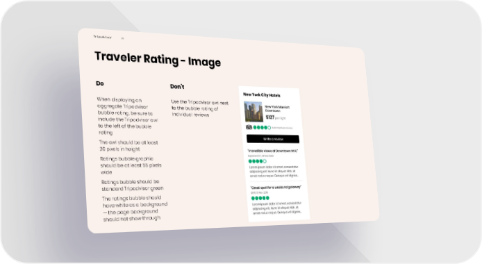 Tripadvisor When displaying an aggregate Tripadvisor bubble rating, be sure to include the Tripadvisor owl to the left of the bubble rating The owl should be at least 20 pixels in height Ratings bubble graphic should be at least 55 pixels wide Ratings bubble should be standard Tripadvisor green The ratings bubble should have white as a background — the page background should not show through Use the Tripadvisor owl next to the bubble rating of individual reviews Traveler Rating - Image 29 Do Don’t