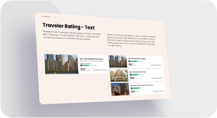 Tripadvisor Traveler Rating - Text 28 Whenever the Tripadvisor rating appears, it should have the text “Tripadvisor Traveler Rating” next to it — along with the number of reviews on which the rating is based. If there isn’t enough space (e.g. in search results), a fallback option is to have a logo at the top or on the left, indicating that the traveler ratings are provided by Tripadvisor. Each rating should also have a rollover with the text “Tripadvisor Traveler Rating.”