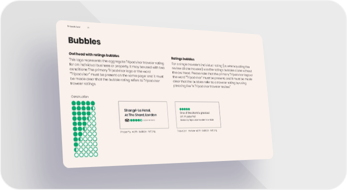 Tripadvisor Owl head with ratings bubbles This logo represents the aggregate Tripadvisor traveler rating for an individual business or property. It may be used with two conditions: The primary Tripadvisor logo or the word “Tripadvisor” must be present on the same page; and it must be made clear that the bubble rating refers to Tripadvisor traveler ratings. Bubbles 25 Ratings bubbles For a single traveler’s individual rating (i.e. when quoting the review of one traveler), use the ratings bubbles alone without the owl head. Please note that the primary Tripadvisor logo or the word “Tripadvisor” must be present, and it must be made clear that the bubbles refer to a traveler rating by using phrasing like “A Tripadvisor traveler review.” Traveler review with bubble rating. Property with bubble rating. Construction One of the World's greatest art museums! Review by Tripadvisor traveler 1 Mar 2020 Shangri-La Hotel, At The Shard, London 3,334 reviews
