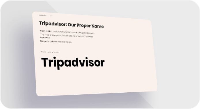 Tripadvisor When written, the following format should always be followed: “T” of “Trip” is always capitalized and “a” of “advisor” is always lowercase. No space between the two words. Tripadvisor: Our Proper Name 20 Tripadvisor Proper name written: