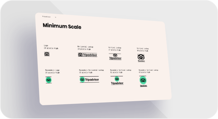 Tripadvisor Minimum Scale 10 Horizontal Lockup 20 pixels high Vertical Lockup 37 pixels high Logo 20 pixels high Vertical Lockup 50 pixels high Secondary Horizontal Lockup 35 pixels high Secondary Vertical Lockup 52 pixels high Secondary Logo 35 pixels high Secondary Vertical Lockup 69 pixels high