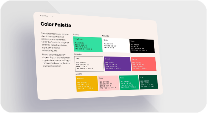 Tripadvisor The Tripadvisor color palette should be applied in all partner placements that utilize the Tripadvisor logo or content, including stickers, signs, out of home advertising, etc. Use of color should vary depending on the surface or application, always striking a balance between optimism and sophistication. Primary Color Palette 21 TripGreen HEX #34E0A1 RGB 52 224 161 CMYK 60 0 50 0 PMS 3385 C / 3375 U Sand HEX #FAF1ED RGB 250 241 237 CMYK 1 4 6 2 PMS 9285 C / 9345 U Orchid HEX #7446AF RGB 116 70 175 CMYK 69 83 0 0 PMS 7678C / 2077 U Salmon HEX #FF6666 RGB 255 102 102 CMYK 0 65 45 0 PMS 2029C / 2029 U Mustard HEX #F2B203 RGB 242 178 3 CMYK 0 29 100 1 PMS 124 C / 129 U Rose HEX #FFCCCC RGB 255 204 204 CMYK 0 20 5 0 PMS 7422 C / 7422 U Moss HEX #00AA6C RGB 0 170 100 CMYK 81 3 64 10 PMS 7724 C / 7724 U Pine HEX #004F32 RGB 0 79 53 CMYK 87 15 77 69 PMS 3435 C / 343 U White HEX #FFFFFF RGB 255 255 255 CMYK 0 0 0 0 Black HEX #000000 RGB 0 0 0 CMYK 60 40 40 100 PMS Black C / Black U Secondary Neutrals Accents