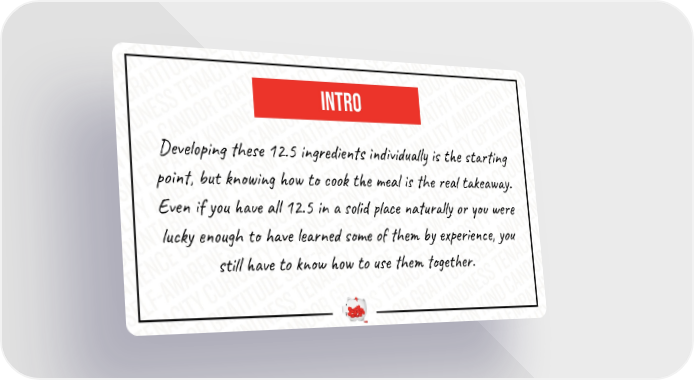 intro Developing these 12.5 ingredients individually is the starting point, but knowing how to cook the meal is the real takeaway. Even if you have all 12.5 in a solid place naturally or you were lucky enough to have learned some of them by experience, you still have to know how to use them together.