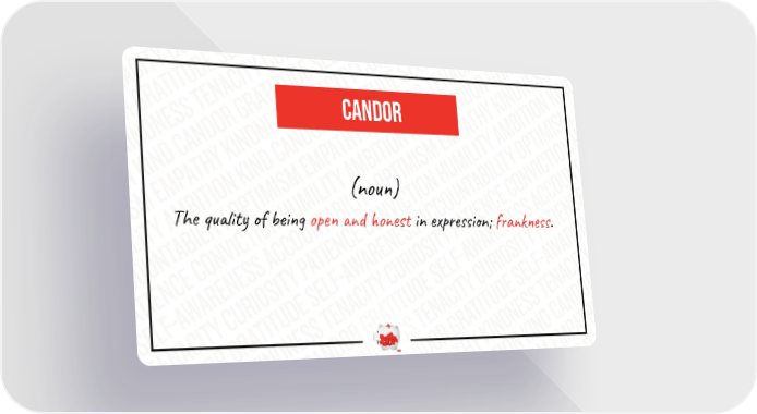 candor (noun) The quality of being open and honest in expression; frankness.