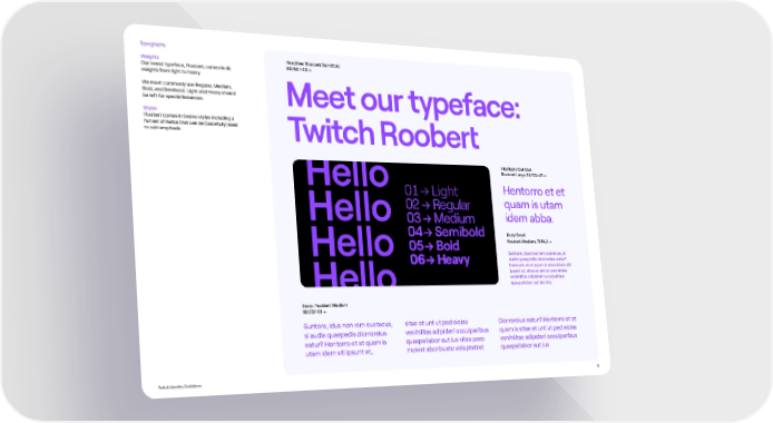 Typography Weights Headline: Roobert SemiBold Our brand typeface, Roobert, comes in six 80/80/-20 → weights from light to heavy. Hello We most commonly use Regular, Medium, Bold, and Semibold. Light and Heavy should be left for special instances. Meet our typeface: Hello Styles Roobert comes in twelve styles including a full set of italics that can be (tastefully) used to add emphasis. Twitch Roobert Hello Highlight/Call Out Hello Roobert Large 30/33/-15 → 01→ Light Hentorro et et 02→ Regular quam is utam Hello 03→ Medium idem abba. 04→ Semibold Body Small 05→ Bold Roobert Medium, 11/14,0 → Hello Suntore, idus non rem custecus, si 06→ Heavy audia quaepedis diorroreius eatur? Hentorro et et quam is utam idem siti ipsunt et, sitae et unt ut ped eicias venihilitas adipideri occulparibus Hello quaspellabor aut ius vita. Body: Roobert Medium 16/20/-10 → Suntore, idus non rem custecus, sitae et unt ut ped eicias Diorroreius eatur? Hentorro et et si audia quaepedis diorroreius venihilitas adipideri occulparibus quam is sitae et unt ut ped eicias eatur? Hentorro et et quam is quaspellabor aut ius vitae pero venihilitas adipideri occulparibus utam idem siti ipsunt et, molest aboribusto voluptatiist quaspellabor aut ius Twitch Identity Guidelines 12