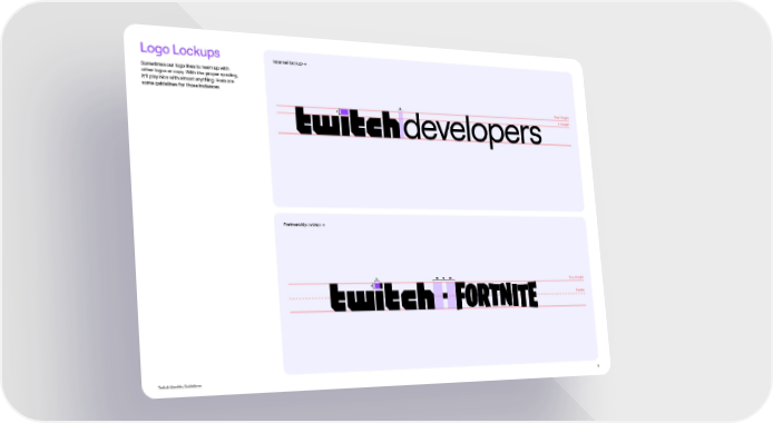 Logo Lockups Internal lockup → Sometimes our logo likes to team up with other logos or copy. With the proper spacing, it’ll play nice with almost anything. Here are some guidelines for those instances. Cap Height X-Height Partnership lockup → Cap Height Center Twitch Identity Guidelines 6