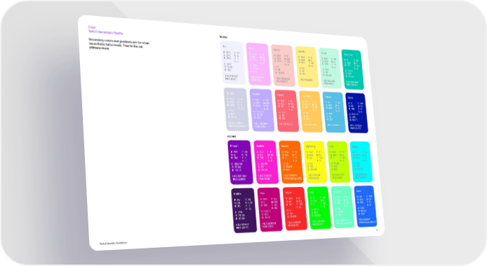 Color Muted Twitch Secondary Palette Secondary colors and gradients are for when Ice Jiggle Worm Isabelle Droid Wipe Out we activate turbo mode. They’re like our R 240 C 10 R 250 C 0 R 250 C 0 R 254 C 2 R 190 C 26 R 0 C 80 ultimate move. G 240 M 4 G 180 M 32 G 205 M 26 G 238 M 2 G 250 M 0 G 200 M 0 B 255 Y 2 B 255 Y 10 B 205 Y 20 B 133 Y 59 B 225 Y 14 B 175 Y 40 K 1 K 0 K 0 K 0 K 0 K 0 H 240 H 296 H 0 H 50 H 155 H 172.5 S 5.88 S 29.41 S 18 S 47 S 24 S 100 B 100 B 100 B 98.04 B 99 B 98.04 B 78.43 HEX F0F0FF HEX FAB4FF HEX FACDCD HEX FEEE85 HEX BEFAE1 HEX 00C8AF PMS 656C PMS 920C PMS 9261C PMS 621C PMS 3255C Smoke Widow Peach Pac-Man Felicia Sonic R 210 C 12 R 190 C 30 R 252 C 0 R 255 C 0 R 87 C 58 R 0 C 100 G 210 M 8 G 170 M 25 G 102 M 75 G 202 M 22 G 190 M 6 G 20 M 75 B 230 Y 8 B 255 Y 0 B 117 Y 40 B 95 Y 72 B 230 Y 3 B 165 Y 0 K 22 K 0 K 0 K 0 K 0 K 0 H 240 H 264.32 H 352 H 39 H 196 H 232.73 S 8.7 S 72.55 S 59 S 62 S 61 S 100 B 90.2 B 100 B 98 B 100 B 90 B 64.71 HEX D2D2E6 HEX BFABFF HEX FC6675 HEX FFCA5F HEX 57BEE6 HEX 0014A5 PMS Cool Gray 3 PMS 270C PMS 2147C Accent Dragon Cuddle Bandit Lightning K.O. Mega R 130 C 68 R 250 C 0 R 255 C 10 R 250 C 0 R 190 C 12 R 0 C 45 G 5 M 78 G 30 M 78 G 105 M 7 G 250 M 0 G 255 M 0 G 250 M 0 B 180 Y 0 B 210 Y 0 B 5 Y 0 B 25 Y 100 B 0 Y 80 B 250 Y 0 K 0 K 0 K 4 K 0 K 0 K 0 H 282.86 H 310.91 H 24 H 60 H 75.29 H 180 S 97.22 S 88 S 98.04 S 90 S 100 S 100 B 70.59 B 98.04 B 100 B 98.04 B 100 B 98.04 HEX 8205B4 HEX FA1ED2 HEX FF6905 HEX FAFA19 HEX BEFF00 HEX 00FAFA PMS 2084C PMS 806C PMS Orange 021C PMS 803C PMS 395C PMS 9464C Nights Osu Sniper Egg Legend Zero R 65 C 85 R 190 C 45 R 250 C 0 R 0 C 50 R 105 C 40 R 30 C 100 G 20 M 100 G 0 M 100 G 40 M 95 G 250 M 0 G 255 M 0 G 105 M 15 B 95 Y 0 B 120 Y 50 B 40 Y 100 B 5 Y 85 B 195 Y 25 B 255 Y 0 K 10 K 60 K 0 K 0 K 0 K 0 H 276 H 322.11 H 0 H 121.2 H 156 H 220 S 78.95 S 100 S 84 S 100 S 58.82 S 88.24 B 37.25 B 74.51 B 98.04 B 98.04 B 100 B 100 HEX 41145F HEX BE0078 HEX FA2828 HEX 00FA05 HEX 69FFC3 HEX 1E69FF PMS 2617C PMS 233C PMS 032C PMS 802C PMS Green 0921C PMS Process Blue C Twitch Identity Guidelines 9