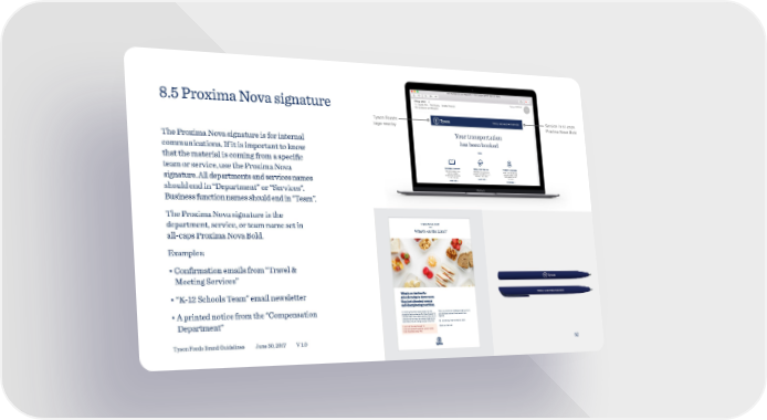 8.5 Proxima Nova signature Tyson Foods Service in all-caps logo nearby Proxima Nova Bold The Proxima Nova signature is for internal communications. If it is important to know that the material is coming from a specific team or service, use the Proxima Nova signature. All departments and services names should end in “Department” or “Services”. Business function names should end in “Team”. The Proxima Nova signature is the K-12 SCHOOLS TEAM department, service, or team name set in — all-caps Proxima Nova Bold. What’s on the Line? Examples: • Confirmation emails from “Travel & Meeting Services” • “K-12 Schools Team” email newsletter • A printed notice from the “Compensation It’s about giving kids opportunities and the Talk to us about the hallenges boiling over in strength to help win the day. Our Tyson Foods K-12 your kithens and we’ll help takle the Shools Tea never stops learning. e know it together. an eel like the trays are staked against you Department” and that so uh is riding on your lunh line. e’re listening. nd we want to know€ Fro K all the way through 12. hat’s on the line‚ Fro proureent needs to protein needs. Fro the S to the T . Tyson Foods Brand Guidelines June 30, 2017 V 1.0 52