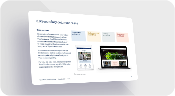 3.6 Secondary color use cases Tone-on-tone Tyson’s Pride Dark mustard seed Dark sage Dark cayenne We occasionally use tone-on-tone values on C/M/Y/K on C/M/Y/K on C/M/Y/K on C/M/Y/K of our colors in long form applications. This treatment should be used to draw attention to or separate information, or to create visual rhythm in scenarios with heavy use of Tyson’s Pride blue. For tone-on-tone secondary colors, use Our story Innovation Responsible food Loved brands We care Transparency the dark value for text (not the main value) Our 2016 Sustainability Report set on top of the light value background. Subhead about the report here This ensures legibility. For tone-on-tone blue, simply use Tyson’s Reduced our total Pride blue for text on top of its light value recordable incident About this report rate by 12% compared About yson to fiscal 2013 counterpart as the background. LEARN MORE > — Workforce Tone-on-tone use in web. and culture Lorem ipsum dolor sit amet consectetuer adipiscin elit sed diam nonummy nib euismod tincidunt Tyson Foods Brand Guidelines June 30, 2017 V 1.0 LEARN MORE > 18 More than 91 chaplains provide compassionate Animal ellbein Responsibility pastoral care to team members and their amiles LEARN MORE > ie sustainability Marketplace report archive Environment Si AR E > Home | Site Map | Privacy Policy | Terms of Use | Leal | ontact Us Copyright © 2017 Tyson Foods, Inc. Trademarks and registered trademarks are owned by Tyson Foods, Inc. or its subsidiaries