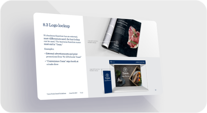 8.3 Logo lockup If a business function has an external, must-differentiate need, the logo lockup Logo with business can be used. The business function name function lockup must end in “Team.” Examples: • External advertisements and print promotions from “K-12 Schools Team” • “Convenience Team” expo booth at a trade show Logo with business function lockup Tyson Foods Brand Guidelines June 30, 2017 V 1.0 50