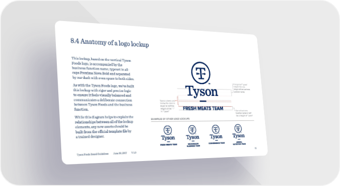 8.4 Anatomy of a logo lockup This lockup, based on the vertical Tyson Foods logo, is accompanied by the business function name, typeset in all- caps Proxima Nova Bold and separated by our dash with even space to both sides. X-height of “Tyson” As with the Tyson Foods logo, we’ve built is twice the cap height of the business this lockup with rigor and precise logic function name to ensure it feels visually balanced and communicates a deliberate connection Space above and between Tyson Foods and the business below the dash is equal to half the function. height of the “T” in “Tyson” Size of business function name is half While this diagram helps to explain the the x-height of “Tyson” relationships between all of the lockup EXAMPLES OF OTHER LOGO LOCKUPS elements, any new assets should be built from the official template file by a trained designer. Tyson Foods Brand Guidelines June 30, 2017 V 1.0 51