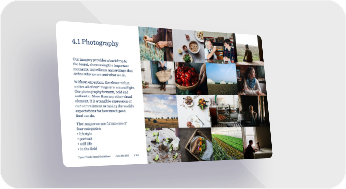 4.1 Photography Our imagery provides a backdrop to the brand, showcasing the important moments, ingredients and settings that define who we are and what we do. Without exception, the element that unites all of our imagery is natural light. Our photography is warm, bold and authentic. More than any other visual element, it is a tangible expression of our commitment to raising the world’s expectations for how much good food can do. The images we use fit into one of four categories: • lifestyle • portrait • still life • in the field Tyson Foods Brand Guidelines June 30, 2017 V 1.0 23