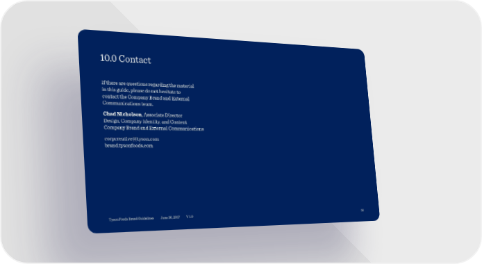 10.0 Contact If there are questions regarding the material in this guide, please do not hesitate to contact the Company Brand and External Communications team. Chad Nicholson, Associate Director Design, Company Identity, and Content Company Brand and External Communications corpcreative@tyson.com brand.tysonfoods.com Tyson Foods Brand Guidelines June 30, 2017 V 1.0 58