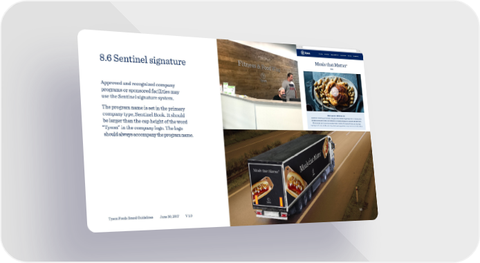 Our story Innovation Responsible food Loved brands We care Transparency ® Meals that Matter 8.6 Sentinel signature — Approved and recognized company programs or sponsored facilities may use the Sentinel signature system. The program name is set in the primary Who we are. What we do. company type, Sentinel Book. It should Great food, made by good people. We grew from humble beginnings into a company that operates across the world. Our company is a leading producer of chicen, beef and por. any people don’t now that we also mae a variety of prepared foods, such as pia be larger than the cap height of the word toppings and crusts, tortillas and chips, deli meats, appetiers, soups sauces and side dishes. “Tyson” in the company logo. The logo should always accompany the program name. HISTORY MAKING OF A MEAL LOCATIONS Our company started in the Our food begins on the farm. We have more than ,€€€ mid €s from the bac of ‚ee how we’re involved in Team embers in more than a truc. ‚ee how we’ve getting it to your table. €€ ƒ.‚. locations and in grown through time. operations across the globe. LEARN MORE > LEARN MORE > LEARN MORE > Tyson Foods Brand Guidelines June 30, 2017 V 1.0 53