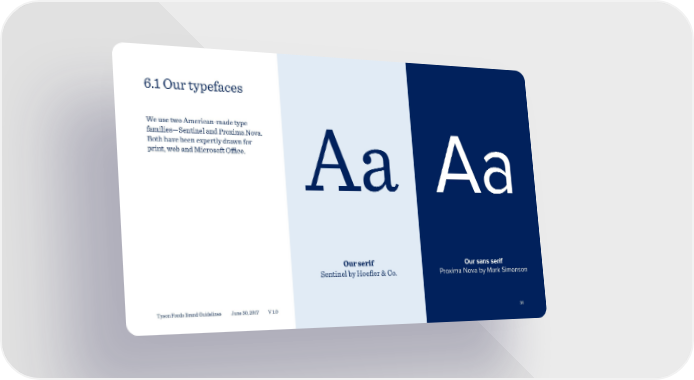 6.1 Our typefaces We use two American-made type families—Sentinel and Proxima Nova. Both have been expertly drawn for print, web and Microsoft Office. Aa Aa Our serif Our sans serif Sentinel by Hoefler & Co. Proxima Nova by Mark Simonson Tyson Foods Brand Guidelines June 30, 2017 V 1.0 36