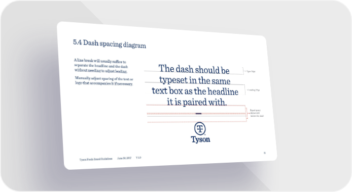 5.4 Dash spacing diagram A line break will usually suffice to separate the headline and the dash The dash should be Type 50pt without needing to adjust leading. Manually adjust spacing of the text or typeset in the same logo that accompanies it if necessary. text box as the headline Leading 53pt it is paired with. Equal space — above and below the dash Tyson Foods Brand Guidelines June 30, 2017 V 1.0 31
