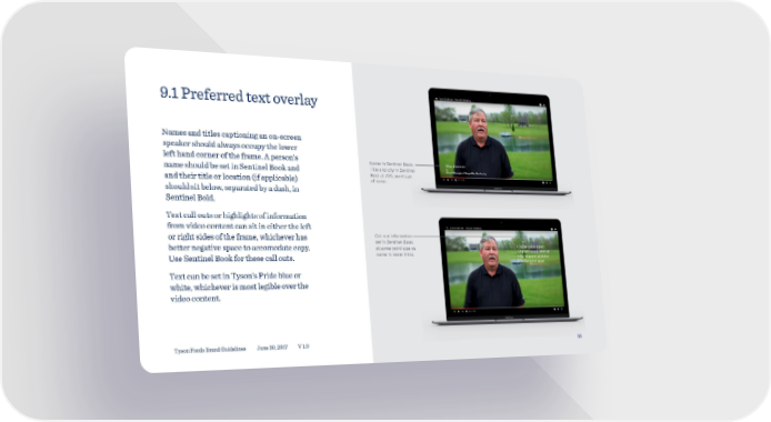 9.1 Preferred text overlay Names and titles captioning an on-screen speaker should always occupy the lower left hand corner of the frame. A person’s Name in Sentinel Book. name should be set in Sentinel Book and Title and city in Sentinel Bold at 70% point size and their title or location (if applicable) of name. should sit below, separated by a dash, in Sentinel Bold. Text call outs or highlights of information from video content can sit in either the left or right sides of the frame, whichever has Call out information set in Sentinel Book better negative space to accomodate copy. at same point size as Use Sentinel Book for these call outs. name in lower third. Text can be set in Tyson’s Pride blue or white, whichever is most legible over the video content. Tyson Foods Brand Guidelines June 30, 2017 V 1.0 55