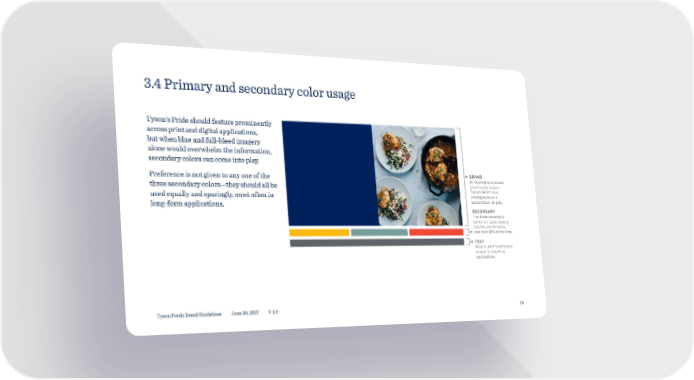 3.4 Primary and secondary color usage Tyson’s Pride should feature prominently across print and digital applications, but when blue and full-bleed imagery alone would overwhelm the information, secondary colors can come into play. Preference is not given to any one of the BRAND All applications should three secondary colors—they should all be prominently feature Tyson’s Pride blue, used equally and sparingly, most often in photography or a long-form applications. combination of both. SECONDARY The three secondary colors are used equally but only on occasion, less than 10% of the time. TEXT Gray is used functionally as text in long form applications. Tyson Foods Brand Guidelines June 30, 2017 V 1.0 14