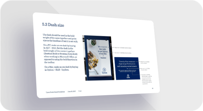 5.3 Dash size The dash should be used in the bold weight of the same typeface and point size as the headline of text it is set with. On a PC, make an em dash by keying Headline in 121/126pt Sentinel Book in ALT + 0151. Set the dash in the bold weight of the correct typeface Em dash in 121/126pt Sentinel Bold (Sentinel Bold or Proxima Nova Bold) when working in Microsoft Office, as opposed to using the bold function in the toolbar. Twenty-four seasons Headline in 27/29pt of great performances Sentinel Book On a Mac, make an em dash by keying and amazing entertainers. in Option + Shift + hyphen. — Em dash in 27/29pt We’re proud to support the Walton Arts Center Sentinel Bold and their twenty-fourth season of the arts. Subhead in 12/14pt Sentinel Bold. Leading manually increased between first line of text and dash above so that it sits optically equidistant. Tyson Foods Brand Guidelines June 30, 2017 V 1.0 30