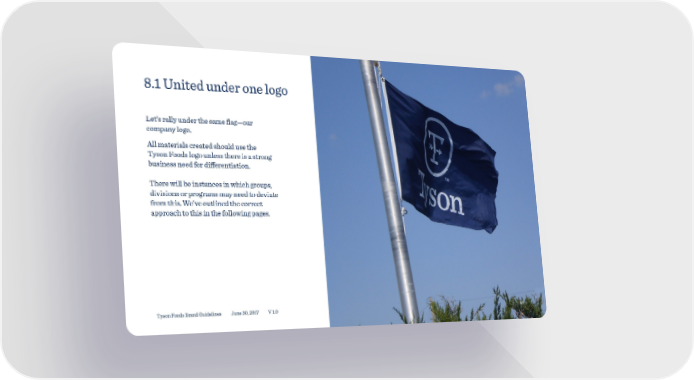 8.1 United under one logo Let’s rally under the same flag—our company logo. All materials created should use the Tyson Foods logo unless there is a strong business need for differentiation. There will be instances in which groups, divisions or programs may need to deviate from this. We’ve outlined the correct approach to this in the following pages. Tyson Foods Brand Guidelines June 30, 2017 V 1.0 48