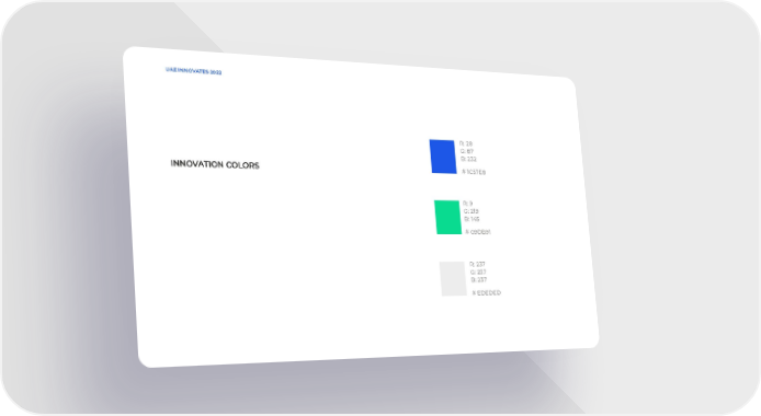 UAE INNOVATES 2022 INNOVATION COLORS R: 28 G: 87 B: 232 # 1C57 E8 R: 9 G: 219 B: 145 # 09DB91 R: 237 G: 237 B: 237 # EDEDED