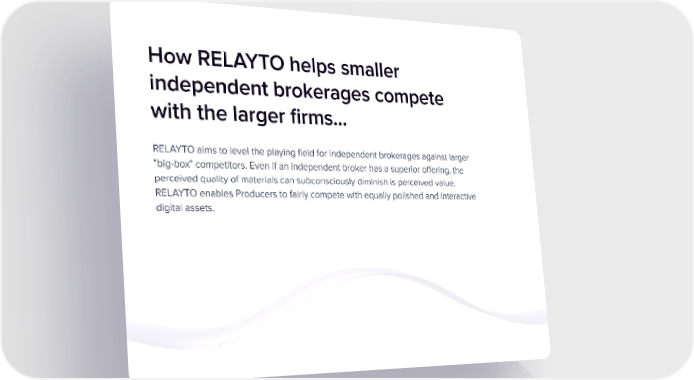 How RELAYTO helps smaller independent brokerages compete with the larger firms… RELAYTO aims to level the playing field for independent brokerages against larger "big-box" competitors. Even if an independent broker has a superior offering, the perceived quality of materials can subconsciously diminish is perceived value. RELAYTO enables Producers to fairly compete with equally polished and interactive digital assets.