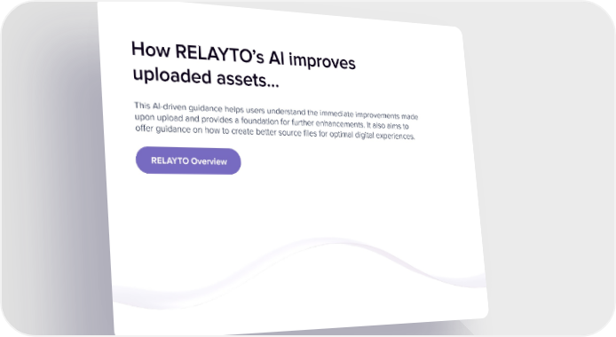 How RELAYTO’s AI improves uploaded assets… This AI-driven guidance helps users understand the immediate improvements made upon upload and provides a foundation for further enhancements. It also aims to offer guidance on how to create better source files for optimal digital experiences. RELAYTO Overview