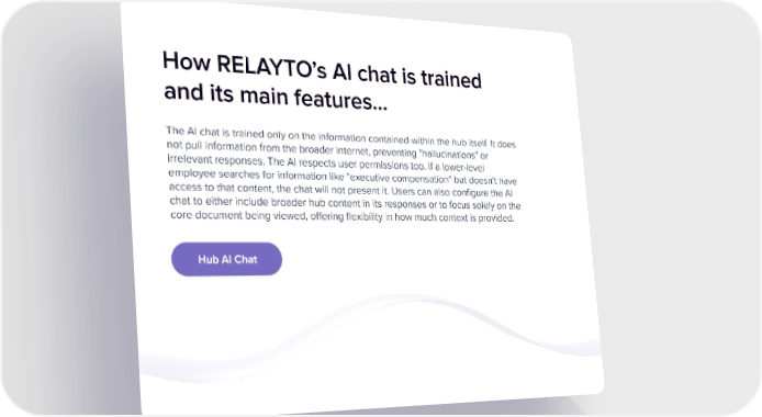 How RELAYTO’s AI chat is trained and its main features… The AI chat is trained only on the information contained within the hub itself. It does not pull information from the broader internet, preventing "hallucinations" or irrelevant responses. The AI respects user permissions too. If a lower-level employee searches for information like "executive compensation" but doesn't have access to that content, the chat will not present it. Users can also configure the AI chat to either include broader hub content in its responses or to focus solely on the core document being viewed, offering flexibility in how much context is provided. Hub AI Chat