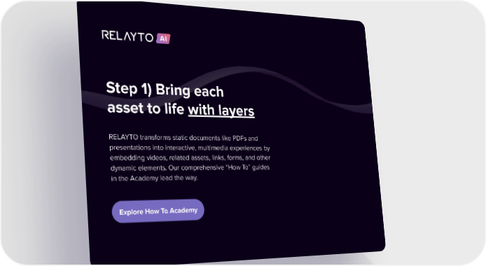 Step 1) Bring each asset to life with layers RELAYTO transforms static documents like PDFs and presentations into interactive, multimedia experiences by embedding videos, related assets, links, forms, and other dynamic elements. Our comprehensive “How To” guides in the Academy lead the way. Explore How To Academy