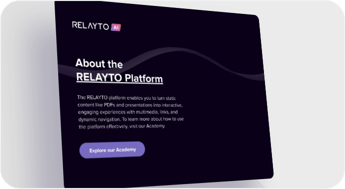 About the RELAYTO Platform The RELAYTO platform enables you to turn static content like PDFs and presentations into interactive, engaging experiences with multimedia, links, and dynamic navigation. To learn more about how to use the platform effectively, visit our Academy. Explore our Academy