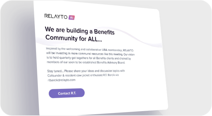 Inspired by the welcoming and collaborative UBA membership, RELAYTO will be investing in more communal resources like this meeting. Our vision is to hold quarterly get togethers for all Benefits clients and chaired by members of our soon to be established Benefits Advisory Board. Stay tuned… Please share your ideas and discussion topics with Cofounder & resident cow jacket enthusiast R.T. Barcik via [email protected] We are building a Benefits Community for ALL… Contact R.T.