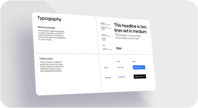 Typography Headline Uber Move Display Medium This headline is two 6 words or more 1.5x logo point size (minimum) 1.0 leading Hierarchy example 0 tracking lines set in medium It is important to organize typography Subhead This subhead is 1/2 the point size in a hierarchical system according to Uber Move Display Light relative importance or inclusiveness ½ headline of the headline and set to light through scale and function depending 1.2 leading on communication. 0 tracking Logo Logo height = composition margin width Calls to action There are 2 ways to create and Action Button identify call-to-actions for brand communications. Use Uber Move Text Bold for Action and Uber Inactive Move Display Bold for Buttons. Hover/Active