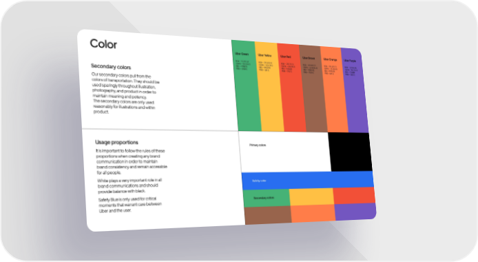 Color Uber Green Uber Yellow Uber Red Uber Brown Uber Orange Uber Purple RGB — 71 179 117 RGB — 255 192 67 RGB — 230 76 53 RGB — 153 100 77 RGB — 255 125 73 RGB — 115 86 191 CMYK — 93 0 63 0 CMYK — 0 21 76 0 CMYK — 0 82 80 0 CMYK — 13 56 61 32 CMYK — 79 59 0 0 CMYK — 80 74 0 0 HEX — 47B275 HEX — FFC043 HEX — F25138 HEX — 99644C HEX — FF7D49 HEX — 7356BF PMS — 2416 C PMS — 135 C PMS — 7417 C PMS — 7525 C PMS — 164 C PMS — 2102 C Secondary colors Our secondary colors pull from the colors of transportation. They should be used sparingly throughout illustration, photography, and product in order to maintain meaning and potency. The secondary colors are only used reasonably for illustrations and within product. Usage proportions Primary colors It is important to follow the rules of these proportions when creating any brand communication in order to maintain brand consistency and remain accessible for all people. White plays a very important role in all Safety color brand communications and should provide balance with black. Safety Blue is only used for critical Secondary colors moments that warrant care between Uber and the user.