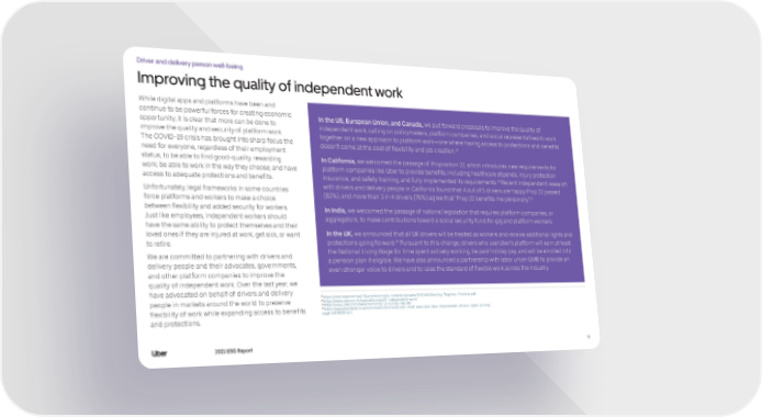 Driver and delivery person well-being Improving the quality of independent work While digital apps and platforms have been and continue to be powerful forces for creating economic In the US, European Union, and Canada, we put forward proposals to improve the quality of opportunity, it is clear that more can be done to independent work, calling on policymakers, platform companies, and social representatives to work improve the quality and security of platform work. together on a new approach to platform work—one where having access to protections and benefits The COVID-19 crisis has brought into sharp focus the 13 need for everyone, regardless of their employment doesn’t come at the cost of flexibility and job creation. status, to be able to find good-quality, rewarding In California, we welcomed the passage of Proposition 22, which introduces new requirements for work; be able to work in the way they choose; and have platform companies like Uber to provide benefits, including healthcare stipends, injury protection 14 access to adequate protections and benefits. insurance, and safety training, and fully implemented its requirements. Recent independent research Unfortunately, legal frameworks in some countries with drivers and delivery people in California found that 4 out of 5 drivers are happy Prop 22 passed force platforms and workers to make a choice (82%), and more than 3 in 4 drivers (76%) agree that “Prop 22 benefits me personally.”15 between flexibility and added security for workers. In India, we welcomed the passage of national legislation that requires platform companies, or Just like employees, independent workers should aggregators, to make contributions toward a social security fund for gig and platform workers. have the same ability to protect themselves and their loved ones if they are injured at work, get sick, or want In the UK, we announced that all UK drivers will be treated as workers and receive additional rights and 16 to retire. protections going forward. Pursuant to this change, drivers who use Uber’s platform will earn at least We are committed to partnering with drivers and the National Living Wage for time spent actively working, be paid holiday pay, and will be enrolled into delivery people and their advocates, governments, a pension plan if eligible. We have also announced a partnership with labor union GMB to provide an and other platform companies to improve the even stronger voice to drivers and to raise the standard of flexible work across the industry. quality of independent work. Over the last year, we have advocated on behalf of drivers and delivery 13https://ubernewsroomapi.10upcdn.com/wp-content/uploads/2020/08/Working-Together-Priorities.pdf people in markets around the world to preserve 14https://www.uber.com/blog/california/p22-independent-work/ 15https://www.uber.com/newsroom/prop-22-survey-results/ flexibility of work while expanding access to benefits 16https://www.standard.co.uk/comment/comment/uber-chief-executive-dara-khosrowhahi-drivers-rights-turning- page-b924529.html and protections. 2021 ESG Report 31