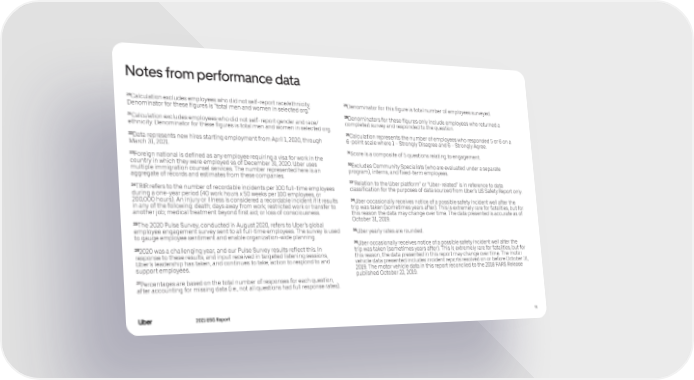 Notes from performance data 20 28 Calculation excludes employees who did not self-report race/ethnicity. Denominator for this figure is total number of employees surveyed. Denominator for these figures is “total men and women in selected org.” 29Denominators for these figures only include employees who returned a 21 Calculation excludes employees who did not self-report gender and race/ completed survey and responded to the question. ethnicity. Denominator for these figures is total men and women in selected org. 30Calculation represents the number of employees who responded 5 or 6 on a 22 Data represents new hires starting employment from April 1, 2020, through 6-point scale where 1 = Strongly Disagree and 6 = Strongly Agree. March 31, 2021. 31Score is a composite of 5 questions relating to engagement. 23Foreign national is defined as any employee requiring a visa for work in the country in which they were employed as of December 31, 2020. Uber uses 32Excludes Community Specialists (who are evaluated under a separate multiple immigration counsel services. The number represented here is an program), interns, and fixed-term employees. aggregate of records and estimates from these companies. 33“Relation to the Uber platform” or “Uber-related” is in reference to data 24TRIR refers to the number of recordable incidents per 100 full-time employees classification for the purposes of data sourced from Uber’s US Safety Report only. during a one-year period (40 work hours x 50 weeks per 100 employees, or 200,000 hours). An injury or illness is considered a recordable incident if it results 34Uber occasionally receives notice of a possible safety incident well after the in any of the following: death; days away from work; restricted work or transfer to trip was taken (sometimes years after). This is extremely rare for fatalities, but for another job; medical treatment beyond first aid; or loss of consciousness. this reason the data may change over time. The data presented is accurate as of October 31, 2019. 25The 2020 Pulse Survey, conducted in August 2020, refers to Uber’s global employee engagement survey sent to all full-time employees. The survey is used 35Uber yearly rates are rounded. to gauge employee sentiment and enable organization-wide planning. 36Uber occasionally receives notice of a possible safety incident well after the 262020 was a challenging year, and our Pulse Survey results reflect this. In trip was taken (sometimes years after). This is extremely rare for fatalities, but for response to these results, and input received in targeted listening sessions, this reason, the data presented in this report may change over time. The motor Uber’s leadership has taken, and continues to take, action to respond to and vehicle data presented includes incident reports resolved on or before October 31, support employees. 2019. The motor vehicle data in this report reconciled to the 2018 FARS Release published October 22, 2019. 27Percentages are based on the total number of responses for each question, after accounting for missing data (i.e., not all questions had full response rates). 2021 ESG Report 91