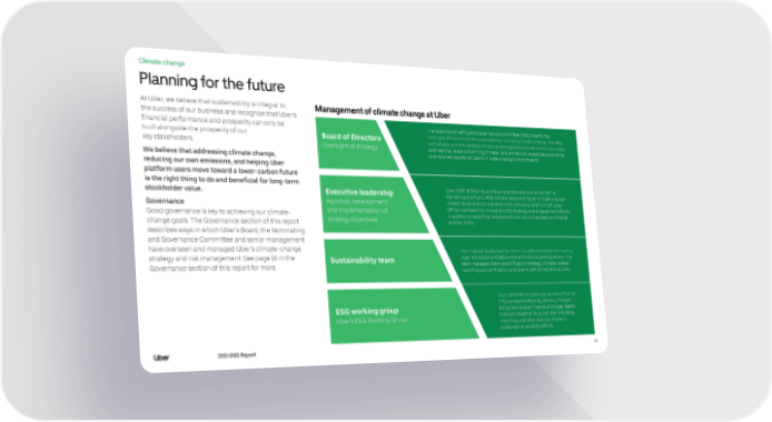 Climate change Planning for the future At Uber, we believe that sustainability is integral to Management of climate change at Uber the success of our business and recognize that Uber’s financial performance and prosperity can only be The Board Nominating and Governance Committee (NGC) has formal built alongside the prosperity of our Board of Directors oversight of environmental sustainability, including climate change. The NGC key stakeholders. periodically receives updates on policy and regulatory trends at the local, state, Oversight of strategy and national levels concerning climate- and emissions-related developments We believe that addressing climate change, and receives reports on Uber’s climate-change commitments. reducing our own emissions, and helping Uber platform users move toward a lower-carbon future is the right thing to do and beneficial for long-term stockholder value. Executive leadership Uber’s SVP of Mobility and Business Operations and the SVP of Marketing and Public Affairs share responsibility for climate change– Governance Approval, development, related issues and policies within the company. Uber’s Chief Legal Good governance is key to achieving our climate- and implementation of Officer oversees the company’s ESG strategy and engagement efforts, strategy objectives. in addition to reporting responsive to the recommendations of SASB change goals. The Governance section of this report and the TCFD. describes ways in which Uber’s Board, the Nominating and Governance Committee and senior management have overseen and managed Uber’s climate-change Uber’s global Sustainability Team includes members from policy, strategy and risk management. See page 16 in the Sustainability team legal, workplace and data science functions, among others. The Governance section of this report for more. team manages Uber’s electrification strategy, climate-related reporting and verification, and Uber’s path to net zero by 2040. Uber’s ESG Working Group has more than 50 FTEs across the Mobility, Delivery, Freight, ESG working group Policy, Workplace, Finance, and Legal teams Uber’s ESG Working Group that work together to guide Uber’s strategy, reporting, and other aspects of Uber’s sustainability and ESG efforts. 2021 ESG Report 69