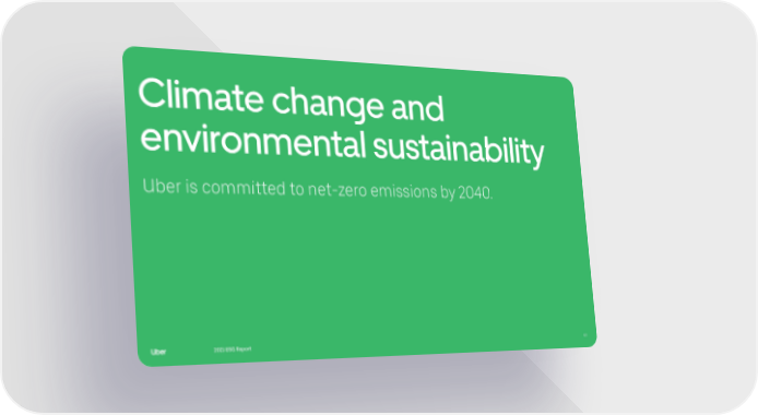 Uber ESG Report Page 62 Page 64Climate change and environmental sustainability Uber is committed to net-zero emissions by 2040. 202021 21 ESG ReportESG Report 6363