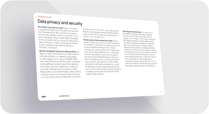 Integrity and trust Data privacy and security We collect only what we need. Data minimization and basic account information; and a View as Driver We safeguard personal data. Our users trust us is a goal for all teams, and not just our privacy and feature, which provides riders with visibility into the to protect their personal information whenever security experts. For Uber products, campaigns, personal information drivers can see about them they use our apps. Uber’s information security and services, we keep a specific objective in mind before, during, and after a trip. program, which is based on the industry-recognized when collecting, using, or handling personal data We give users choices about their data. At Uber, ISO 27001/2 framework, includes written policies, that is consistent with our values. One example is we don’t believe privacy has to come at the expense processes, and standards designed to protect the Mask Verification, a feature that detects whether of innovation. In fact, we think protecting consumer security, confidentiality, and integrity of Uber’s a user is wearing a mask without relying on privacy is essential to being a truly innovative data environment. Uber has maintained ISO 27001 biometric information. company. Our privacy product team is responsible certification for its enterprise business line (Uber for We are transparent about our data practices. We for building tools and features in our mobile apps Business, Uber Central, and Uber Health) since 2019 keep our users informed about our data collection that can help protect privacy while using Uber’s and in 2021 obtained the certification for its core and use practices in our layered Privacy Notice, services. Some of these features can be found in rides business. Additionally, in 2020, Uber obtained our Help pages, and our app and website, where the Privacy Settings menu, including controls for SOC 2 certification and was assessed by an users have the ability to edit their data, modify their sharing location data with Uber or with trusted independent assessor against NIST 800-171 for its privacy settings, request a copy of their personal contacts, for notifications received from us, and Uber for Business commercial offerings to become information, and more. Additionally, in 2020, we for deleting an account. Users also have control approved as a US government contract service. launched 2 new features: an Explore Your Data over how their personal data is used for marketing feature where, once authenticated, users can find a purposes, and may opt out of having their data convenient summary of personal data including a used for these purposes. summary of trips, Uber Eats deliveries, rider rating, 2021 ESG Report 61
