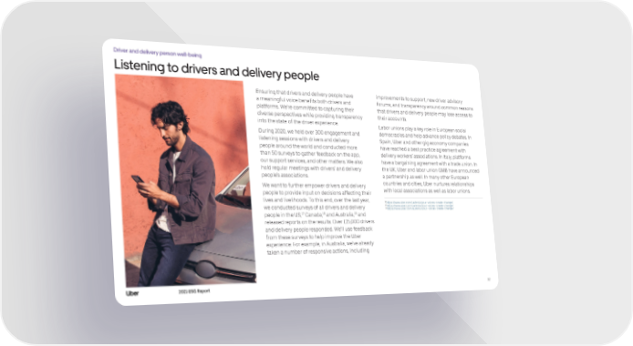 Driver and delivery person well-being Listening to drivers and delivery people Ensuring that drivers and delivery people have improvements to support, new driver advisory a meaningful voice benefits both drivers and forums, and transparency around common reasons platforms. We’re committed to capturing their that drivers and delivery people may lose access to diverse perspectives while providing transparency their accounts. into the state of the driver experience. Labor unions play a key role in European social During 2020, we held over 300 engagement and democracies and help advance policy debates. In listening sessions with drivers and delivery Spain, Uber and other gig economy companies people around the world and conducted more have reached a best practice agreement with than 50 surveys to gather feedback on the app, delivery workers’ associations. In Italy, platforms our support services, and other matters. We also have a bargaining agreement with a trade union. In hold regular meetings with drivers’ and delivery the UK, Uber and labor union GMB have announced people’s associations. a partnership as well. In many other European We want to further empower drivers and delivery countries and cities, Uber nurtures relationships people to provide input on decisions affecting their with local associations as well as labor unions. lives and livelihoods. To this end, over the last year, 17https://www.uber.com/us/en/u/your-voices-create-change/ 18https://www.uber.com/ca/en/u/your-voices-create-change/ we conducted surveys of all drivers and delivery 19https://www.uber.com/au/en/u/your-voices-create-change/ 17 18 19 people in the US, Canada, and Australia, and released reports on the results. Over 125,000 drivers and delivery people responded. We’ll use feedback from these surveys to help improve the Uber experience. For example, in Australia, we’ve already taken a number of responsive actions, including 2021 ESG Report 32