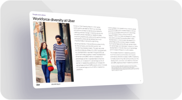 People and culture Workforce diversity at Uber Since our first Diversity Report in 2017, we’ve Looking deeper into race/ethnicity in the US, we see continued to use data to inform our priorities a 2.8-percentage-point increase of Black or African and actions; to keep ourselves accountable for American employees overall and a 0.3-percentage- creating positive change in diversity, equity, and point decrease of Black or African American inclusion; and to motivate our leaders to keep leaders.** Within our Asian and Hispanic or Latinx improving. Additionally, we’ve continued to prioritize populations, we see the opposite pattern. Asian transparency because we believe that it is an representation in the US overall decreased by 2.5 important step in doing the right thing. percentage points, but Asian leaders increased Building diversity in the workforce is a key priority by 2.5 percentage points. Although we see a slight for the company, and the CEO and ELT are 0.4-percentage-point decrease in Hispanic or Latinx monitoring progress closely. This year we pulled representation in the US, there is a 1.4-percentage- workforce data as of March 31, 2021. Compared with point increase of Hispanic or Latinx leaders. our representation reported in August 2020, we The increase of women in leadership positions continue to see progress in overall representation is primarily due to a combination of hiring and of women and URPs,* with an increase of 1.9 promotions, while the increase in URPs in leadership percentage points in representation of women is mostly due to hiring. We continue to focus on the overall, an increase of 1.2 percentage points of development, promotion, and retention of women women in leadership positions, an increase of 5 and URPs, especially those in leadership positions. percentage points of URPs overall, and an increase *At Uber, we include employees identifying as Black, African American, Hispanic, of 2.9 percentage points of URPs in leadership and Latinx in the category of Underrepresented People (URP), as these groups are underrepresented within Uber compared with the overall US population. positions. **The overall headcount of Black or African American talent in leadership remained the same since August 2020; the percentage appears to dip because our overall non-Black leadership headcount increased. 2021 ESG Report 47