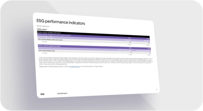 ESG performance indicators Social indicators Safety data³³ Motor vehicle fatalities (US rides) Motor vehicle fatalities by vehicle miles traveled³⁴ 2017 2018 (Per 100 million VMT) Uber rate³⁵ Uber rate³⁵ Motor vehicle fatalities by vehicle miles traveled 0.59 0.57 Total miles 8.2 billion 10.2 billion Motor vehicle fatalities by trips³⁶ 2017 2018 # of Uber-related fatalities # of Uber-related fatalities Motor vehicle fatalities by trips 49 58 Total trips 1.0 billion 1.3 billion In the US, the National Highway Traffic Safety Administration (NHTSA) makes annual traffic fatality information available to the public through the Fatality Analysis Reporting System (FARS). The motor vehicle fatality data in Uber’s US Safety Report is built off the data standards established by FARS. Each fatal crash in the Uber dataset was reconciled to a fatal crash in the FARS database. For a fatal motor vehicle crash to be included in the Safety Report, the crash must have involved the vehicle of at least one driver using the Uber platform and the death of at least one person within 30 days of the crash. Fatal crashes are included in the US Safety Report regardless of whether the deceased party was an Uber user or whether a driver using the Uber platform or their vehicle was the cause of the crash or was carrying the deceased parties. Please see the ‘Methodology’ section of Uber’s US Safety Report for more information on these metrics. 2021 ESG Report 86